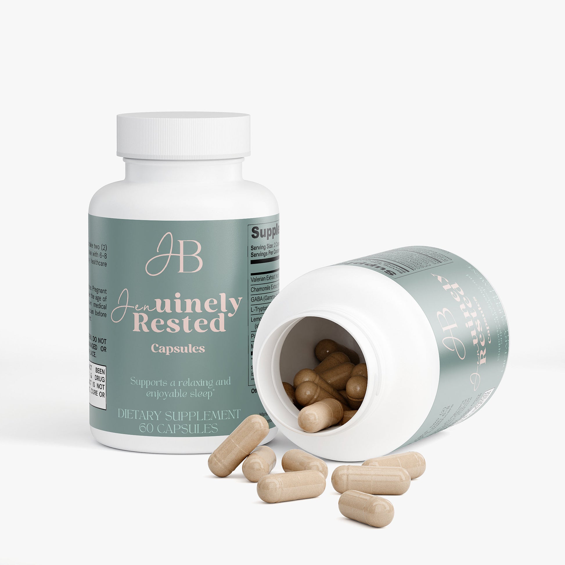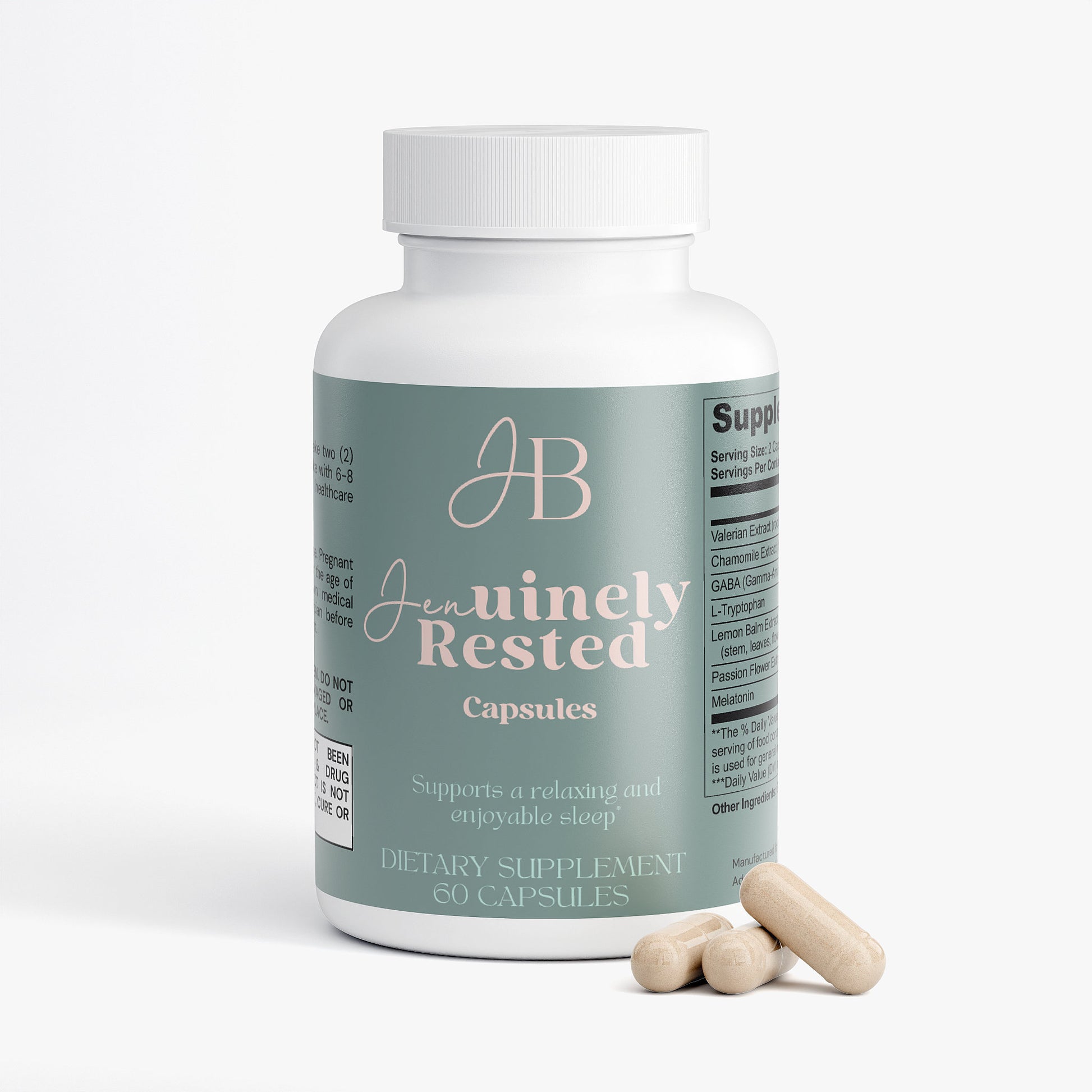 Jenuinely Rested is crafted to foster restful and rejuvenating sleep through a blend of natural ingredients. It is designed to promote a tranquil night’s sleep, leveraging the synergistic effects of Valerian Extract, Chamomile, GABA, and more. This carefully formulated supplement supports your body's natural sleep cycle without the use of artificial additives, ensuring a holistic approach to better sleep.*